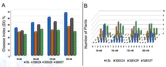 After 8 weeks, our results showed that cotton seedling bacterization with three antagonistic endophytic actinobacterial strains XIEG24, XIEG29, and XIEG57 reduced the cotton disease incidence symptoms caused by V. dahliae compared to non-bacterized control. Noticeably, the results presented in (Figure 4A) indicated that cotton seedling bacterization with three selected antagonistic strains could slow disease development, and the expression of signs was delayed compared to the control plantlets under pathogen-challenged at different salt concentrations. For instance, our potential biocontrol strain XIEG57 exhibited the highest reduction of cotton disease incidence (DI) symptoms caused by V. dahliae up to 33.3, 37.5, 35.3, and 37.8% at 50, 100, 150, and 200 mM NaCl, respectively, compared to uninoculated plants. Although all tested endophytic actinobacterial strains conferred some degree of Verticillium wilt resistance, the distribution of disease grades varied dramatically at different salt concentrations compared to uninoculated controls (Figure 4B).