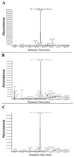 GC-MS analysis of potential bioactive compounds in ethyl acetate extracts of cell supernatant buffered of four co-cultures endophytic actinobacterial strains, (A) Streptomyces albidoflavus (XIEG24), (B) Curtobacterium flaccumfaciens (XIEG29), and (C) Nocardiopsis alba (XIEG57) with V. dahliae.