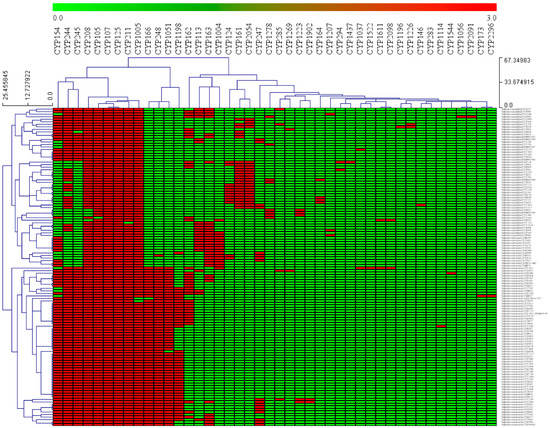 Heat-map of P450 family conservation or co-presence analysis in Salinispora species. In the heat-map, the presence and absence of P450 families are indicated in red and green colors. The horizontal axis represents P450 families, and the vertical axis represents Salinispora species.