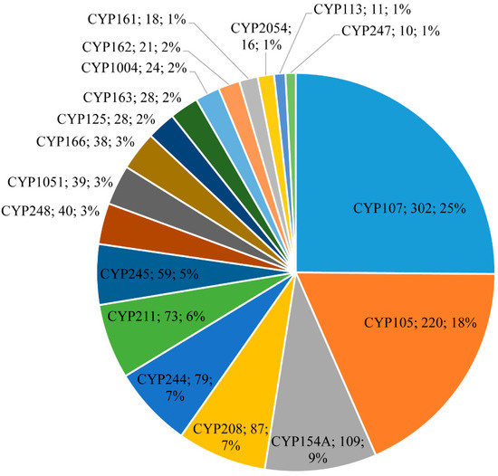 Among 2643 P450s, 1236 P450s belonging to the 35 P450 families were part of smBGCs (Figure 3 and Table 4 and Table S1). This means almost 78% of P450 families of Salinispora species are involved in secondary metabolism. Among the families that are part of smBGCs, CYP107 is dominant with 302 members (25%), followed by CYP105 with 220 members (18%), CYP208 with 87 members (7%), CYP244 with 79 members (7%), and CYP211 with 73 members (6%) (Figure 3 and Table S1). Analysis of the P450s part of smBGCs revealed a strong correlation between the dominant P450 families (Table 3) being dominant in smBGCs (Figure 3). This suggests that Salinispora species are enriched by blooming or expanding these P450 families (as discussed in the previous section) in their genome to produce secondary metabolites.