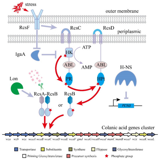- Clarke, D.J. The RCS phosphorelay: More than just a two-component pathway. Future Microbiol. 2010, 5, 1173–1184. [Google Scholar] [CrossRef]