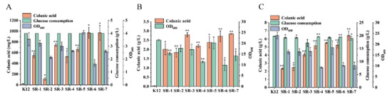 Relieving the regulation of the RCS phosphorylation system on the synthesis of colanic acid and the optimization of medium. (A) Colanic acid titers of SR recombinant strains in M9 medium at 30 °C in shake flasks. (B) Colanic acid titers of SR recombinant strains in TB medium at 30 °C in shake flasks. (C) Colanic acid titers of SR recombinant strains in TBG medium at 30 °C in shake flasks. Statistical data analysis was performed with t-texts in SPSS 25.0. p values of <0.05 were considered statistically significant, and statistical significance is indicated as * for p < 0.05 and ** for p < 0.01.