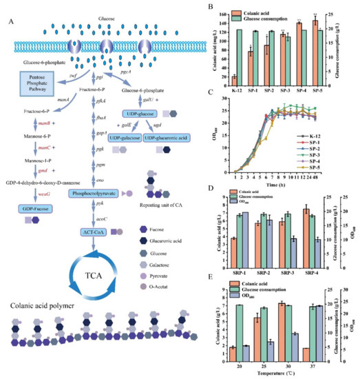 Enhancement of colanic acid production by overexpression of precursors. (A) The metabolic pathway of glucose in Escherichia coli K-12 and the structure of colanic acid. (B) Colanic acid titers of SP recombinant strains in TBG medium at 30 °C in shake flasks. (C) Growth curves of SP recombinant strains in TBG medium at 30 °C in shake flasks. (D) Colanic acid titers of SRP recombinant strains in TBG medium at 30 °C in shake flasks. (E) Colanic acid titers of the SRP-4 strain in TBG medium at different temperatures in shake flasks. Statistical data analysis was performed with t-texts in SPSS 25.0. p values of <0.05 were considered statistically significant, and statistical significance is indicated as * for p < 0.05 and ** for p < 0.01.