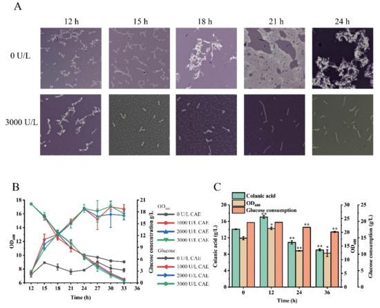 Colanic acid capsule layer inhibited strain growth and glucose acquisition. (A) The formation of the colanic acid capsule and the disruption of the colanic acid capsule after adding the hydrolase. (B) The growth and glucose consumption of the SRP-4 strain at 30 °C in shake flasks after adding different amounts of colanic acid hydrolase. (C) The colanic acid titers of the SRP-4 strain after adding 4000 U/L hydrolase at different times. Statistical data analysis was performed with t-texts in SPSS 25.0. p values of <0.05 were considered statistically significant, and statistical significance is indicated as * for p < 0.05 and ** for p < 0.01.