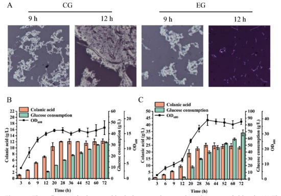 The influence of colanic acid hydrolase on colanic acid production on fed-batch. (A) The condition of the colanic acid capsule of SRP-4 strain on a 3-L bioreactor. A total of 4000 U/L colanic acid hydrolase was added to EG. CG, control group. EG, experimental group. (B) The colanic acid titer of SRP-4 on a 3-L bioreactor without adding the colanic acid hydrolase. (C) The colanic acid titer of SRP-4 on a 3-L bioreactor with 4000 U/L colanic acid hydrolase added. Both the CG and EG was supplemented glucose at 9 h and the glucose concentration was maintained between 9 and 12 g/L. The dissolved oxygen was maintained over 30%.