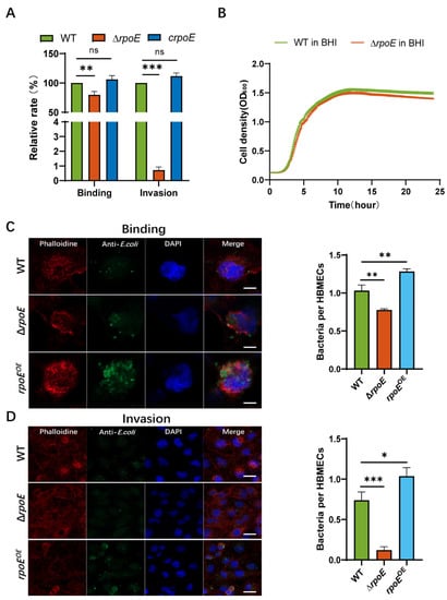 Deletion of rpoE reduces Escherichia coli K1 binding to and invasion of human brain microvascular endothelial cells (HBMECs). (A) The binding and invasion abilities of ΔrpoE and crpoE strains were calculated relative to those of the wild-type (WT) strain. (B) Growth of RS218 WT and ΔrpoE strains in brain-heart infusion (BHI) medium. (C) Number of bacterial cells per each HBMEC determined in random fields of fluorescent actin staining (FAS) in a binding assay. Average of at least 50 cells is shown (left). Scale bar, 5 μm. (D) Number of bacterial cells per HBMEC determined in random fields of FAS in an invasion assay. Average of at least 50 cells is shown (left). Actin cytoskeleton (red) and nuclei (blue) of the HBMECs, and bacterium (green) are shown. Scale bar, 20 μm. * p < 0.05, ** p < 0.01, *** p < 0.001 by Student’s t-test. ns, not significant.