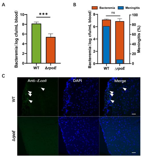 To investigate the role of rpoE in E. coli K1 infection, we examined the ability of the RS218 WT and ΔrpoE strains to survive in the blood of BALB/c mice. Each animal received 1 × 107 CFU of RS218 WT and ΔrpoE strains via tail vein injection to induce meningitis. Then, blood specimens were collected and cultured for divergent levels of bacteremia (WT, 8.14 ± 0.10 mean log CFU/mL of blood; ΔrpoE, 5.39 ± 0.40 mean log CFU/mL of blood, p < 0.001, Figure 2A), suggesting that rpoE expression plays a role in promoting E. coli K1 proliferation in mouse blood.