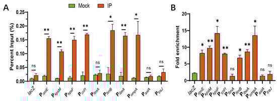 ChIP-qPCR was performed to identify which toxic genes could be directly regulated by RpoE. RpoE binds to a highly conserved ‘AAC’ motif and a clustering of ‘CGT’ trinucleotides in the 35 region and 10 region, respectively [40], and activates its own promoter in response to cytoplasmic stress [34]. Therefore, we used rpoE as a positive control and a (GC)-rich gene lacZ as a negative control for the ChIP assay. ChIP-qPCR analysis revealed that PrpoE, PkpsM, PkpsF, Pcnf1, PfimB, PibeA, and PompA, were enriched 8.25-, 9.77-, 14.19-, 8.05-, 6.8-, 8.66-, and 13.55-fold, respectively, in IP-ChIP samples compared to those of mock ChIP samples (Figure 4A,B), confirming the binding of virulence genes in vivo. In contrast, the fold enrichment of lacZ, PfimA, PaslA, and PtraJ does not differ between the IP-ChIP and mock-ChIP samples (Figure 4A,B). These results demonstrate that RpoE influences the expression of many virulence genes through direct or indirect regulation in vivo.