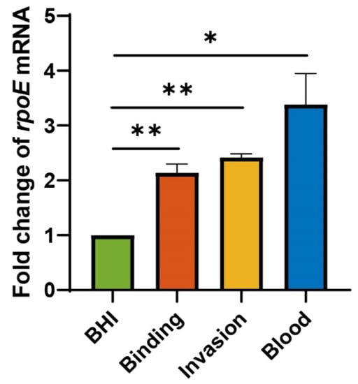 The transcriptional levels of rpoE vary during the diffident infectious phase. The expression of the rpoE gene increases the binding and invasion 2.141- and 2.418-fold, respectively (Figure 5), compared with that cultured in BHI. These data suggest that rpoE needs more expression to enhance the virulence in E. coli K1 binding and invasion of HBMECs. As the WT strain was able to form high-level bacteremia, we tested the expression of rpoE in blood compared to that in BHI (Figure 5). The expression level of rpoE was 3.385-fold higher in blood than that in the BHI medium. The above results illustrate that some signals in serum of PMI 1640 medium or blood activate the expression of rpoE.