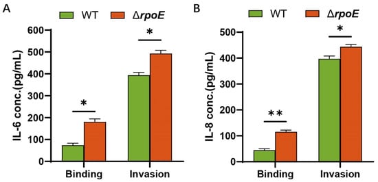 Cytokine release by HBMECs incubated with E. coli K1. (A) The levels of IL-6 in the culture supernatants of HBMECs that infected WT and ΔrpoE. (B) The levels of IL-8 in the culture supernatants of HBMECs that infected WT and ΔrpoE. Data were obtained from three independent experiments and analyzed using Student’s t-test. * p < 0.05, ** p < 0.01.