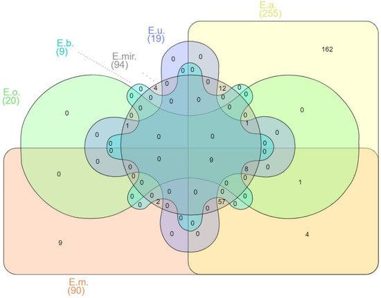 Venn diagram of shared virulence factor genes of Elizabethkingia spp. E.m.—E. meningoseptica; E.a.—E. anophelis; E.mir.—E. miricola; E.o.—E. occulta; E.u.—E. ursingii; E.b.—E. bruuniana. Edwards mode was used to process virulence factor gene outputs for Venn diagram visualization with InteractiVenn [74].