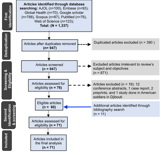 The primary search identified 1337 study articles, 60 of which were eligible (Figure 1). The secondary search identified 11 additional eligible articles, bringing the total to 71 articles included in the final analysis.