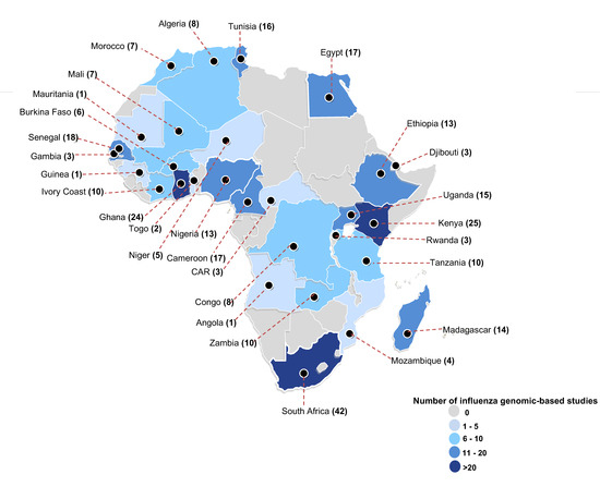 The geographical distribution of studies that did genomic characterization of influenza type-A viruses (H1N1, H1N1pdm09, and H3N2) sampled in Africa. Each country is highlighted based on the absolute number of studies that analyzed sequences of influenza viruses collected from that country. For each country, the study count also includes any study that included at least one sequence from that country in their virus clade classification using the European Center for Disease Control (ECDC) guidelines [27]. Abbreviations: CAR = Central African Republic. Countries not shown: Cape Verde (n = 1), Reunion (n = 3), Seychelles (n = 4), Mauritania (n = 1), Mauritius (n = 10), and Mayotte (n = 1).