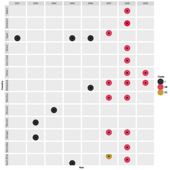 A South Africa strain, A/Johannesburg/141/2007(H1N1), sampled in 2007, shared a similar H1 gene as an American-origin A/St.Petersburg/10/2007-like(clade 2C) strain with HA1 substitutions T82K, Y94H, and K141E [89]. In the same year (2007), new Australian-origin A/Brisbane/59/2007(H1N1)-like strains (clade 2B, mostly oseltamivir-resistant) with HA1 substitutions (D35N, R159K, E274K) emerged in Egypt, Madagascar, Mauritius, and Senegal [41,89]. Clade 2B was widely spread in 2008 in Northern (Algeria), Central (Cameroon), Eastern (Madagascar, Mauritius, Seychelles, Kenya), Western (Ivory Coast, Ghana, Senegal), and Southern Africa (South Africa), clustering according to country of sampling [41,84,88,89,105]. Clade 2B H1N1 strains sporadically spread in Kenya and Madagascar in 2009 [88,105] (Figure 3, Table S8).