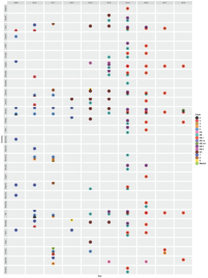 Phylogeographic analysis by Owuor using the Bayesian Ancestral state reconstruction (BSSVS) confirmed the introduction of H1N1pdm09 strains into Africa between 2009 and 2018 from outside Africa, with the highest viral migration rate of 1.48 (Bayes factor, BF ≥ 3) from East and Southeast Asia [98]. Introduction events were inferred as clusters with bootstrap ≥ 80%, size of n ≥ 2 strains, and >80% of strains sampled from Africa. The BSSVS model estimated strongly supported H1N1pdm09 viral migration from Northern to Southern Africa (BF ≥ 1000), between countries (100 ≤ BF < 1000), and within the country (Kenya) (rate = 0.81–0.93, BF ≥ 1000) [98]. Overall, H1N1pdm09 strains sampled in Africa belonged to similar globally recognized clades. However, most clades first circulated elsewhere before their introduction in Africa, except clades 8 and 9 were unique to Africa (Figure S10).