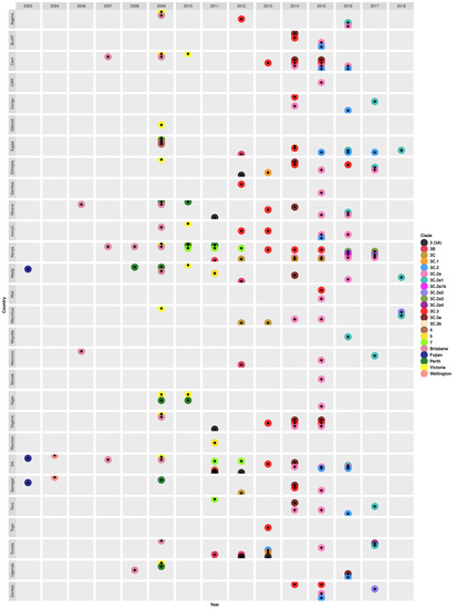 Novel clade 3C.2a, with HA1 substitutions L3I, K160T, N225D, F159Y, and N128K, dominated the 2014–2017 seasons, circulating in 65% (22/34) of the countries sampled [76,77,79,81,96,97,98,99,102]. However, there were notable differences in the patterns of clade circulation within countries. For example, both clade 3C.2a and 3C.3a strains co-circulated in Northern and Southern Cameroon during the 2014–2015 seasons, but 3C.3a strains emerged in Northern in 2015, later than in Southern Cameroon [78,79]. In addition, subclade 3C.3a circulated in Burkina Faso from May to mid-September 2014, but 3C.2a emerged later in August–October 2015 [99]. Furthermore, H3N2 strains sampled in Cameroon, Tanzania, Ethiopia, and Nigeria between 2014 and 2016 switched between clades 3C.3, 3C.2a, and 3C.3a in their N2 and MP phylogenies suggestive of reassortment [78,79].