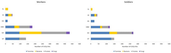 We identified 715 and 542 transcripts annotated as CAZymes in the meta-transcriptomes of H. tenuis workers and soldiers, respectively. These numbers correspond to 2.62% (workers) and 2.75% (soldiers) of the total annotated ORFs in these meta-transcriptomes. We also analyzed the number of annotation hits in each CAZyme class (GHs, GTs, PLs, CEs, AAs, and CBMs) for termites, bacteria, protists, and fungi (Figure 1). The number of CAZy hits was 836 for workers and 618 for soldiers. A higher number of termites endogenous CAZys was observed in soldiers, although differences in CAZyme abundance between workers and soldiers were not statistically significant for any taxonomic group considered.