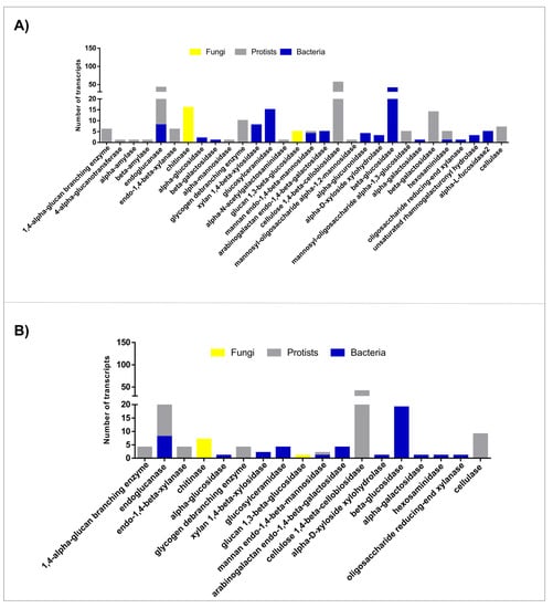 The GH class was the most abundant class of CAZymes for both termite castes studied, especially considering the microbiota. The workers’ microbiota showed a higher diversity of GH families when compared with soldiers as expected. KEGG BRITE annotation also indicated a higher diversity in the workers’ microbiota as well as a significant number of glycoside hydrolases. The most abundant enzymes were endoglucanases, cellulose 1,4-β-cellobiosidade, and β-glucosidase. These enzymes act synergistically in the cellulase system in three steps: (i) first, endonucleases cleave the linear chains of glucose; (ii) the exposed ends of the substrate become available for the activity of exoglucanases (such as cellulose 1,4-β-cellobiosidades); and (iii) β-glucosidases complete the degradation of cellulose []. Our results suggest that the second step is performed exclusively by protists enzymes within H. tenuis microbiota, while bacterial enzymes are responsible for the third step of the process.