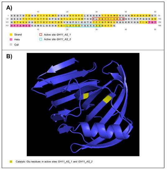 In silico predictions also showed that the encoded protein by HtpXyl presented O-linked glycosylation for 14 out of 47 potential sites, no N-linked glycosylation sites, and 32 phosphorylation sites (Supplementary Figure S1). The inferred secondary structure showed the amount of 15 strands, one helix, and 16 coil structures (Figure 3A). The tertiary structure (Figure 3B) was modeled considering the thermostable mutant of environmentally isolated GH11 xylanase as a template (PDB: 2VUL) [], with 100% of confidence and 100% of coverage. The structure showed anti-parallel β-strands that bend almost 90° and one helix. Within this structural organization, we observed an open-site structure that allows interaction with the substrate. The two glutamic acid residues essential for catalytic activity [] are highlighted in the tertiary structure (Figure 3B).