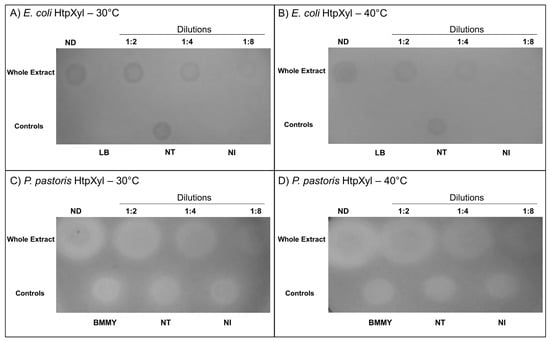 The enzymatic activity of the HtpXyl produced in the two expression systems was evaluated on plates containing xylan agar (1% birch xylan; 2% bacteriological agar). For this, 15 µL of protein extract (~5 µg/µL) and serial dilutions (1:2; 1:4; 1:8) were added to each plate. The protein extract expressed in P. pastoris was concentrated (10×) due to the low expression observed in the SDS-PAGE as later described. The negative controls for the protein expressed in E. coli were LB medium; Rosetta cells (DE3) without plasmid pET28a_HtpXyl (NT), and the sample before induction (NI) with IPTG. The negative controls for the protein expressed in P. pastoris were BMMY medium, X-33 cells without plasmid pPICZαA_HtpXyl (NT), and the sample before induction (NI) with methanol. The plates were incubated for 24 h at two different temperatures: 30 °C and 40 °C. After this period, the medium was stained with 0.2% Congo red for 15 min and then washed with 1M NaCl for 15 min. The appearance of lighter zones indicates the presence of xylanolytic activity [,].