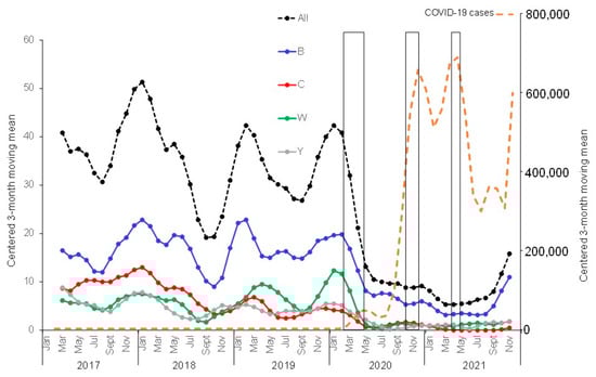 Evolution of IMD cases by serogroup. Data are expressed as the centered 3-month moving means of the number of cases per serogroup. Serogroups are indicated in different colors. Note that the first lockdown was implemented in France on 15 March 2020. COVID-19 cases were also expressed using 3-month moving means (right axis). The three lockdown periods are indicated by boxes (15 March–15 May 2020; 30 October–15 December 2020; 3 April–3 May 2021).
