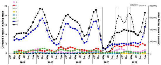 During the period 2017–2021, a total number of 808 IHiD cases were received and characterized at the NRCMHi (137, 177, 189, 132, and 173 cases in 2017, 2018, 2019, 2020, and 2021, respectively). Overall, non-capsulated (non-typable, NTHi) isolates accounted for 550 cases (68.1% of all isolates for the whole 2017–2021 period). The annual numbers of NTHi were 99, 128, 138, 87, and 98 in 2017, 2018, 2019, 2020, and 2021, respectively. The centered 3-month moving mean of IHiD cases suggests that the seasonal pattern of cases that is usually observed in the winter months (December–March) was lost in 2020. A sharp decrease in cases was observed from March 2020 for all Hi isolates (both typeable and non-typeable isolates) (Figure 4). A similar observation was made using centered twelve-month moving mean for the Hi invasive isolates (Figure S2).