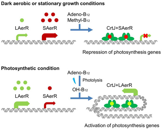 An updated model originally published in [11] that depicts the current understanding of the regulation of photosynthesis gene expression by CrtJ and its co-repressor SAerR (top) and its co-activator LAerR (bottom).