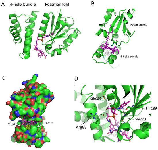 Several hydrogen bonds stabilize cobalamin in place by interacting with its long tail (Figure 2D). Specifically, there are H-bonds between nitrogen in the 5,6-dimethylbenzimidazole ring of cobalamin and highly conserved Gly220, and with a hydroxyl group of Thr189. Thr189 is replaced in other B12-binding domains such as MetH and CarH by Ser or Ala. Arg88 from the four-helix bundle and Glu155 from the Rossman fold also form a H-bond through two water molecules.
