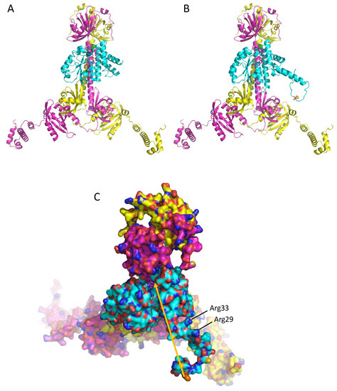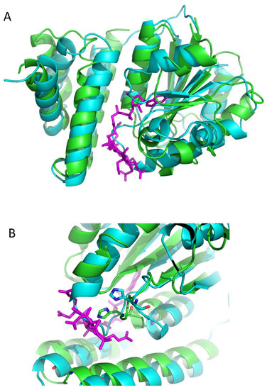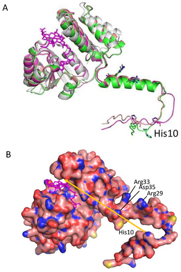 These predictive structures of LAerR contains a 40 amino terminal longer section as compared to our solved crystal structure of SAerR. As shown in Figure 4A, the LAerR model structures are highly superimposed over the solved SAerR structure as represented in magenta. The RMSD score between the same residues in the SAerR structure to the same residues in the LAerR structure is 2.8, which indicates an excellent model fit. The N-terminal’s 40 amino acids in LAreR that are not present in SAerR are modelled into a long flexible tail (residues 1–18) followed by a long α-helix denoted as α1-helix (Phe19-Asn36). Mutational analysis of LAerR has shown that light excitation of adeno- or methyl-cobalamine allows His10 to form an upper ligand with the Co [20]. However, in this dark in silico model of LAerR (where no B12 would be attached), we see that His10 in the flexible amino-terminal tail segment is at a considerable distance from where an upper axial ligand could be formed with cobalamin (Figure 4A,B). One clue for how His10 forms the upper Co axial ligand can be derived from the crystal structure of CarH, which has a similar B12 binding domain. The crystal structure of dark CarH shows that the lower ligand is also a His and that the upper ligand remains in the adeno group [22,23]. However, after light excitation of the corrin ring, the upper adeno axial ligand is released and replaced with a His, not unlike what occurs with LAerR. Furthermore, this light-mediated change in the upper axial ligand causes an ~8 Å movement of the 4-helix bundle cap, which then disrupts tetramerization and DNA binding of CarH [23]. We suspect that a similar movement of the same helix bundle cap occurs in LAerR that would allow His10 to form an axial ligand upon light excitation of B12. Finally, there is a deep groove on one side of LAerR, which could potentially be involved in the docking of the α1 N-terminal helix once there is light-driven formation of a His10 Co axial ligand (Figure 4B).