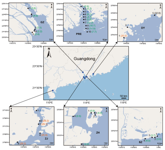 The location of sampling regions. Sampling areas and their abbreviations are as follows: Daya Bay (DY1, DY2, DY5), Pearl River Estuary (PRE1–PRE10), Guangzhou (GZ1–GZ5), Shenzhen (SZ1–SZ4), Zhuhai (ZH1–ZH5), and Zhanjiang (ZJ1–ZJ4, ZJ6). The numbers shown in parentheses represent the salinity of the sampling sites (unit: ‰), and salinity values of freshwater, low-brackish, high-brackish, and marine areas are colored in blue, green, orange, and black, respectively. Adapted with permission from [34] published by John Wiley and Sons, 2022.
