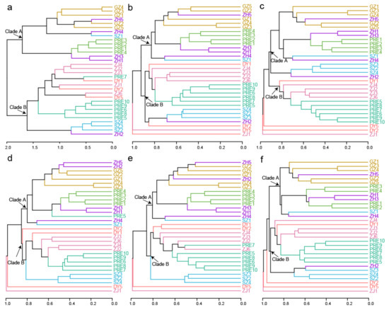 The hierarchical clustering analyses show that oligotrich (s.l.) samples grouped into two major clades in DADA2–100 (Figure 2a). Generally, Clade A consisted of most samples from sampling areas ZH and GZ, as well as samples of PRE1–PRE4. Clade B contained most samples from sampling areas ZJ, SZ, and DY, as well as samples of PRE5–PRE10. Different from the general clustering pattern in DADA2–100 (Figure 2a), samples ZJ1 and DY5 were far from Clade A and Clade B in SWARM–100, UPARSE–97, and UCLUST–97 (Figure 2b,d,e), and samples ZJ1, DY2, and DY5 were far from Clade A and Clade B in UNOISE–100 and UCLUST–99 (Figure 2c,f). Additionally, sample PRE5 fell into Clade A instead of Clade B in UPARSE–97 (Figure 2d). Notably, community structures of ZJ samples were more similar to each other than to PRE samples in DADA2–100 (Figure 2a). By contrast, some ZJ samples clustered with PRE samples first and then with other ZJ samples in all other five datasets (Figure 2b–f).