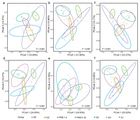 PCoA results showed that oligotrich (s.l.) samples were basically grouped depending on the six sampling areas (DY, GZ, PRE, SZ, ZH, ZJ), and PRE was divided into two groups (PRE1–PRE4, PRE5–PRE10) (Figure 3). ADONIS results supported the significant (p < 0.001) differentiations of community structures among these seven groups based on all six datasets (Figure 3). Consistent with the hierarchical clustering results (Figure 2), samples of PRE1–PRE4 were clearly separated from those of PRE5–PRE10, ZJ, SZ, and DY in all six datasets (Figure 3). However, for DADA2–100, samples of PRE1–PRE4, ZH, and GZ tended to group together and were separated from other sampling sites (Figure 3a).