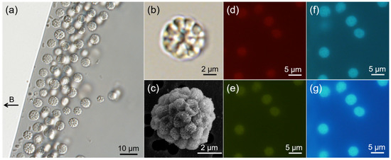 An analysis of DIC images (Figure 1b) and SEM micrographs (Figure 1c) showed that each sMMP contained approximately 14–40 constituent cells arranged with helical symmetry, which also appeared as a radical symmetry on the section image (n = 24). The sMMPs were autofluorescent when illuminated with green, blue, violet, or UV light. The cellular interfaces were evident using autofluorescence excitation at 400–410 nm and 330–385 nm wavelengths (Figure 1f,g), but the cellular contours of MMPs were not distinct when the cells were exposed to illumination at 510–550 nm and 450–480 nm (Figure 1d,e).