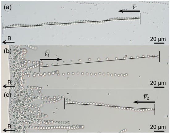 Motility of the sMMPs. Optical micrographs showing magnetotaxis motion (a), and excursion (b) and return (c) of the “ping-pong” motility. The black arrows at the bottom left of each image indicate the direction of the magnetic field. The swimming of the sMMPs was recorded at 20 frames per second (FPS).