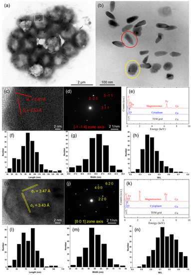 Morphology and characteristics of the magnetosomes of an sMMP cell from Jinsha Bay. (a) Transmission electron micrograph of an sMMP cell. (b) The enlarged image of the white rectangle in the image (a), showing bullet-shaped and irregularly shaped magnetosomes in red and yellow circles, respectively. (c) High-resolution transmission electron microscopy (HRTEM) image of a bullet-shaped magnetosome. (d) The corresponding indexed Fast Fourier transform pattern of the bullet-shaped particle shown in (c). (e) Energy-dispersive X-ray spectroscopy (EDXS) analysis of a bullet-shaped crystal. Histograms of the length (f), width (g), and width/length ratio (h) of bullet-shaped magnetite magnetosomes. (i) HRTEM image of an irregularly shaped magnetosome. (j) The corresponding indexed Fast Fourier transform pattern of the irregularly shaped particle shown in (i). (k) EDXS analysis of an irregularly shaped crystal. Histograms of the length (l), width (m), and width/length ratio (n) of the irregularly shaped greigite magnetosomes.
