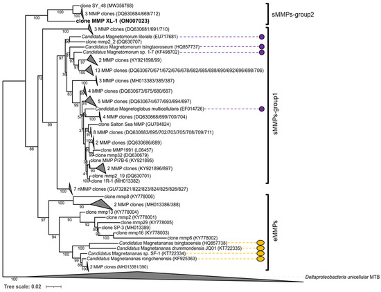 Phylogenetic tree based on 16S rRNA gene sequence analysis. The phylogenetic tree was constructed using the maximum likelihood method using IQ-TREE software. Bootstrap values were calculated using 1000 replicates. The acquired sMMP sequence is indicated in bold. GenBank accession numbers are shown in parentheses. The scale bar represents 2% sequence divergence. The morphologies and characteristics of the sMMPs (labeled by the purple circles) and the eMMPs (labeled by the orange ellipses) have been described.