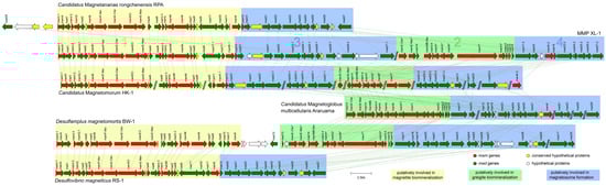 Comparison of MGCs from MMP XL-1 and other previously reported genomes, including Ca. Magnetananas rongchenensis RPA, Ca. Magnetomorum HK-1, Ca. Magnetoglobus multicellularis Araruama, Desulfamplus magnetomortis BW-1, and Desulfovibrio magneticus RS-1. The bars between clusters indicate homologous genes. The magnetosome genes putatively involved in magnetite biomineralization are enclosed by yellow, those putatively involved in greigite biomineralization are enclosed by green, and those putatively involved in magnetosome formation are enclosed by blue.