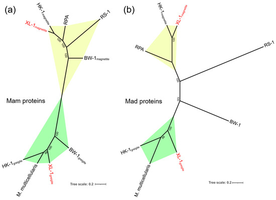 It is noteworthy that the arrangement and identities of magnetosome genes on clusters 1 and 3 of XL-1 were similar to the corresponding magnetite genes of RPA. The set of magnetosome genes on the clusters 2 and 4 of XL-1 had a similar gene order and high similarity to the greigite gene clusters of Ca. Magnetoglobus multicellularis, which implied that the clusters 1 and 3 were involved in the magnetite biomineralization, while clusters 2 and 4 were responsible for the greigite biomineralization within XL-1, respectively (Figure 5). Additionally, the degree of the paralogous Mam and Mad proteins similarities mentioned above was almost the same (46.3–83.8% of the Mam proteins and 52.1–72.2% of the Mad proteins) (Table 1). Furthermore, the clades in the phylogenetic trees based on the Mam and Mad protein sequences were closely consistent as well (Figure 6), suggesting these two sets of mad genes (mad23, mad24, mad25, mad26, and mad27) were likely involved in the magnetite and greigite separately, which were the same as the mam genes (Figure 5, clusters 3 and 4) [31,42,64]. The short gene cluster that included mad23, mad24, mad25, and mad26 has also been identified in all Nitrospirae MTB that synthesize bullet-shaped magnetosomes [72,73], which implies that they are also the core genes for magnetosome biomineralization. In addition, two branches were readily distinguishable on each of the Mam and Mad phylogenetic trees; one of these was involved in magnetite biomineralization and the other with greigite biomineralization (Figure 6). This provides further evidence for the presence of two sets of MGCs within MMP XL-1.