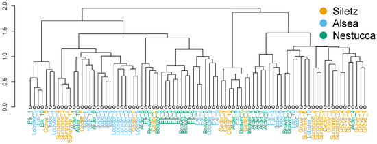 Steelhead gut microbiome samples from three different river basins in Oregon roughly group together. Dendrogram showing hierarchal clustering (Ward’s method with Ward’s clustering criterion) comparing Bray–Curtis dissimilarities between samples. Samples are colored by river basin origin. Samples do not neatly separate into three groups, but the samples tend to cluster into smaller groups with like colors. The differences between steelhead gut microbial composition are confirmed statistically (PERMANOVA, R2 = 0.05, p < 0.01).