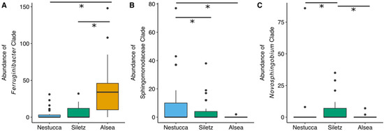 Examples of bacterial clades that are more abundant in each of the three river basins sampled in the geography study. Boxplots visualizing the abundance of steelhead gut microbiome bacterial clades across three western Oregon river basins. Asterisk (*) indicates a statistically significant result using Kruskal-Wallis tests and false discovery rate multiple test correction. (A) shows one clade’s abundances from the genus Ferruginibacter, (B) from the family Sphingomonadcaeae, and (C) from the genus Novosphingobium.