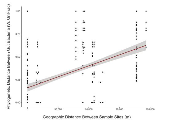 An additional analysis revealed several clades that display correlations between geographic distance and phylogenetic distance in the steelhead gut microbiome, suggesting that these gut bacterial members co-diversified with their hosts. Alternatively, these bacterial clades may manifest a geographic distribution in the environment and then occupy the fish host. Clades demonstrating this geographic and phylogenetic correlation include clades from the bacterial families Rhodobacteraceae and Sphingomonodaceae. Rhodobacteraceae may play a role in fish health, as this family was previously found to be more abundant in the guts of healthy shrimp compared to diseased shrimp [30], but future studies should explicitly test its role in steelhead health. Also, bacterial clades from Sphingomonodaceae produce sphingolipids, which are organic compounds that can modulate O. mykiss mucosal homeostasis and B cell abundance [31]. Although we did not sample mucosal-associated bacteria, mucosal membranes and digesta share some microbial members and microbes in the digesta and lumen can still produce compounds that affect host immune responses [32]. Additionally, Sphingomonadaceae possess sphingolipids in their cell membranes that improve chances of successful colonization and survival in the gut, which can be advantageous for both commensal and pathogenic organisms [33,34]. This speculative role of Rhodobacteraceae and Sphingomonadaceae may be the reason for a potentially prolonged association between these bacterial families and steelhead that gave rise to this geographic lineage sorting.