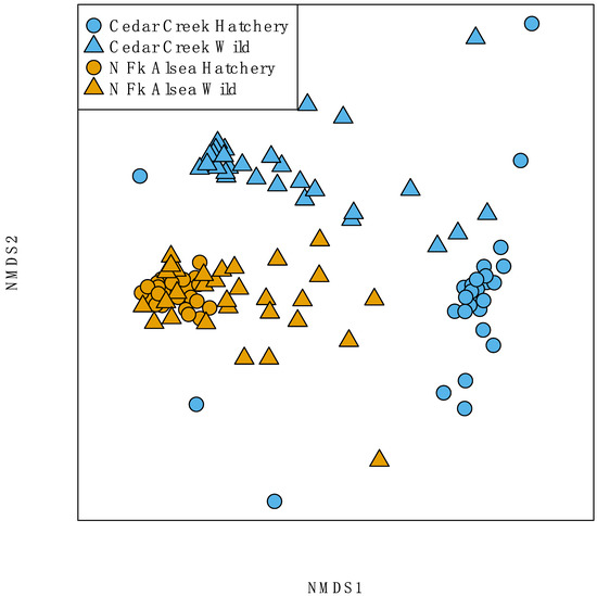 The gut microbiomes of traditional hatchery-reared steelhead differ compositionally compared to their wild broodstock counterparts. NMDS plot showcasing the differences between hatchery broodstock and wild broodstock gut microbial samples (PERMANOVA R2 = 0.29, p < 0.01) as well as differences between Cedar Creek Hatchery and North Fork Alsea Hatchery locations (PERMANOVA R2 = 0.07, p < 0.001). Stress = 0.13. Visually, there is separation between wild steelhead gut microbial composition and hatchery steelhead gut microbial composition within their respective river basins.