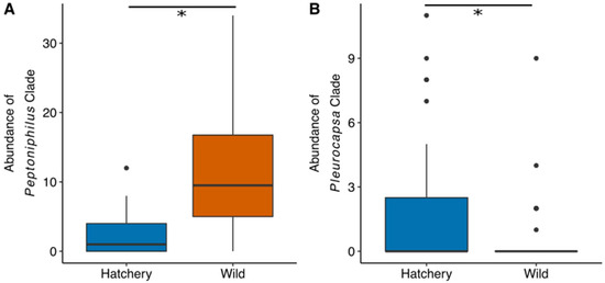 Examples of gut bacterial clades that are more abundant in either traditional hatchery or wild broodstock fish. Asterisk (*) indicates a statistically significant result using Kruskal-Wallis tests and false discovery rate multiple test correction. (A) This Peptonophilus clade example is more abundant in wild broodstock fish guts. (B) The Pluerocapsa clade example is more abundant in traditional hatchery broodstock fish.