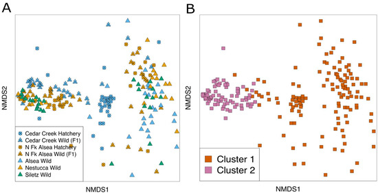 NMDS plots and PAM cluster analysis reveal two clusters that may represent two steelhead gut microbiome types. (A) shows the combined NMDS visualization of all wild-born and hatchery-reared steelhead gut microbiome samples. The samples aggregate into two groups separated by space in the ordination. The coloring based on river basins and the shapes based on management type indicate that neither of these variables separates out into these two clusters. (B) colors each microbiome sample based on the PAM cluster designation and shows that PAM cluster assignment corresponds with the two speculated clusters.