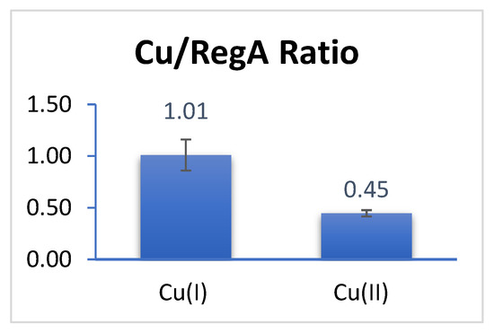 An aliquot of purified RegA was concentrated to 100 μL in a 500 μL centrifugal filter (Amicon, Burlington, MA, USA) with the 10 kDa cutoff by centrifuging at 17,000× g for 8 min. RegA was then buffer exchanged into 20 mM Tris-HCl pH 8.0 250 mM NaCl by repeating the steps of adding 400 μL fresh buffer and centrifuging at 17,000× g five times with final centrifugation run until the sample volume reached 100 μL. The concentration of RegA was then measured using the Bradford method. The RegA sample was then anaerobically loaded with metals by incubating for 5 min with 400 μL 20 mM Tris-HCl pH 8.0 250 mM NaCl containing 3× metal to 1× RegA’s concentration. CuCl and CuSO4 solutions were prepared inside the anaerobic chamber using degassed ddH2O for copper salt preparation. The protein buffer (20 mM Tris-HCl pH 8.0, 500 mM NaCl) used for buffer exchange was also degassed and purged with nitrogen before being brought into the anaerobic chamber. Excessive metal not bound to RegA was then removed from the buffer by repeating Amicon filter centrifugation eight times (maximum speed until ~100 μL concentrated sample was left) with each step involving the addition of 400 μL fresh buffer.