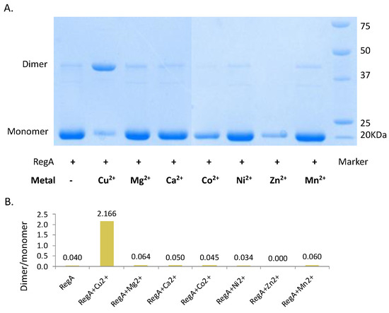 Cu2+ indispensably promotes the dimerization of RegA. (A) Non-reducing SDS-PAGE gel of apo-RegA and RegA treated with divalent metals. + denotes addition of RegA protein whereas –denotes where metal is not added. (B) Histogram of RegA dimer:monomer ratios determined by image J.