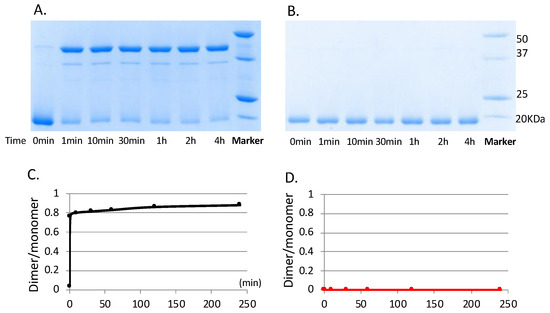 Since Cu2+ binds reduced RegA in a 0.5:1 ratio, we next investigated whether Cu2+ was capable of stimulating dimerization of RegA. For this analysis, monomeric RegA was loaded with Cu2+ via buffer exchange aerobically and immediately run through a non-reducing SDS-PAGE gel with no DTT added to the samples. As shown in Figure 2, the addition of Cu2+ indeed promotes the dimerization of RegA. As observed from the non-reducing SDS-PAGE gel in Figure 3A, Cu2+ mediated dimerization of RegA is also quite rapid, with the majority of RegA dimerized after only one minute of Cu2+ treatment in the presence of air. In contrast, exposure of RegA to air in the absence of Cu2+ did not lead to any significant dimerization even after 4 h of exposure, confirming that Cu2+ in the presence of oxygen serves a critical role in mediating the dimerization of RegA (Figure 3B).