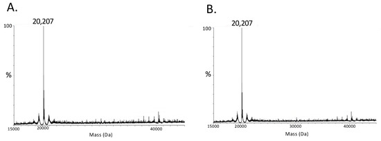 ESI-MS spectrum of RegA in the presence or absence of Cu2+ anaerobically. (A) RegA molecular weight determination by ESI-MS (20,207 daltons) in the presence of Cu2+ without oxygen. (B) RegA molecular weight determination by ESI-MS (20,207 daltons) in the absence of Cu2+ without oxygen.