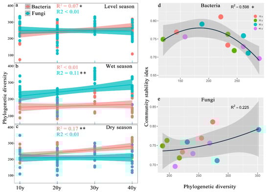 (a–c) Linear relationship between the PD index and the recovery times (significance is indicated by * p < 0.05, ** p < 0.01, n = 56). (d,e) Relationship between assemblage stability and the PD index. (R2 represents the correlation coefficient, and significance is indicated by * p < 0.05, n = 12).