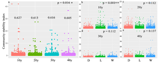 (a–e) Boxplot of the assemblage stability index in the different recovery periods or different seasons. (a) differenct recovery time, (b) 10 y, (c) 20 y, (d) 30 y, (e) 40 y. (The p value indicates the significance of ANOVA between the four recovery times or the three sampling seasons. * and ** represent p < 0.05 and p < 0.01, respectively. D: dry season, L: level season; W: wet season).